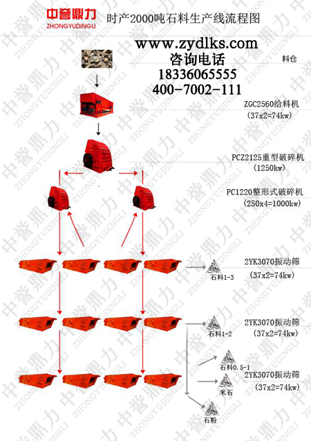 先振動給料機將從山上開采下來的大塊的石頭均勻的送至重型錘式破碎機入料口,重型錘式破碎機可以將物料一次性破碎成型,被破碎后的物料經振動篩篩分后,符合成品粒度的被輸送至各個成品料堆,不符合的物料被重新送回重型錘式破碎機進行再次破碎。如果是時需要達到1000噸以上或產量比較大的采石生產線,我們可以在重型錘式破碎機的下段再加上相應的二破整形錘式破碎機來增加時產。