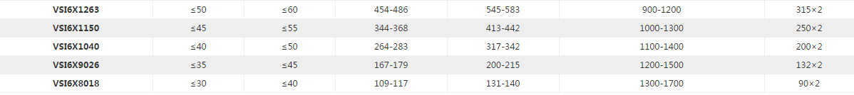 從上面數(shù)據(jù)對比可以看出,ZSJ雙轉(zhuǎn)子制砂機(jī)相比其它制砂機(jī)進(jìn)料粒度是較大的。因此我們在處理物料時(shí)可以減少一些破碎設(shè)備的使用,適當(dāng)減少設(shè)備的投資成本、避免過多浪費(fèi)。例如:在處理花崗巖時(shí),相對生產(chǎn)線會(huì)使用二臺(tái)破碎機(jī)進(jìn)行物料的破碎,而雙轉(zhuǎn)子制砂機(jī)處理只需要使用一臺(tái)破碎設(shè)備即可。