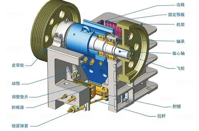 楔塊調(diào)節(jié)方法:增大出料粒度時(shí),通過轉(zhuǎn)動(dòng)螺帽,使楔塊沿著機(jī)架的后壁下降,促使前楔塊向后移動(dòng),實(shí)現(xiàn)推動(dòng)肘板與動(dòng)鄂也向后移動(dòng),進(jìn)而擴(kuò)大開料口,縮小排料口反向操作即可。楔塊調(diào)節(jié)分機(jī)械和液壓兩種方式,液壓方式更省力,無調(diào)節(jié),過鐵保護(hù)及清腔操作。
