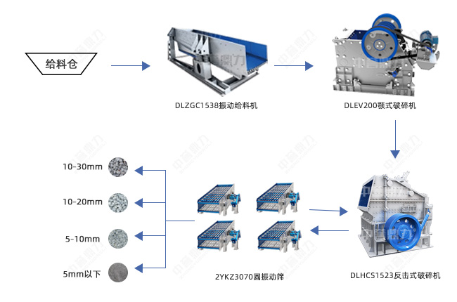 破碎環(huán)節(jié)只用一臺DLPCZ1615重型錘式破碎機,既用來做粗碎,也用來加工頭道篩的返料,取代傳統(tǒng)兩段破碎,較大程度上減少設(shè)備投資成本,頭道篩出10-30mm、10-20mm兩種成品料,二道篩出5-10mm、5mm以下石粉兩種成品料。