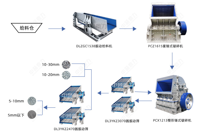設(shè)備配置:DLZGC1538振動給料機、DLPCZ1615重型錘式破碎機、DLPCX1213整形錘式破碎機、2臺DLYKZ3070圓振動篩、2臺DL3YK2470圓振動篩、輸送帶