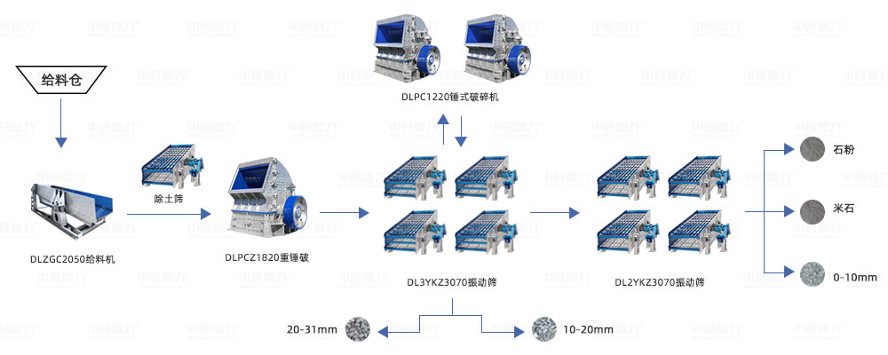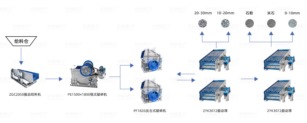 原料倉+ZGC2050振動給料機+PE1500×1800顎式破碎機+PF1820反擊式破碎機*2臺+2YK3072振動篩*4臺。