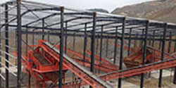 石料生產(chǎn)線在工作過程中,大塊石料經(jīng)料倉由振動給料機(jī)均勻地送進(jìn)重型錘式破碎機(jī)進(jìn)行粗碎,粗碎后的石料由皮帶輸送機(jī)送入錘式破碎機(jī)(或反擊式破碎機(jī))進(jìn)行中碎,中碎后的石料由膠帶輸送機(jī)送進(jìn)振動篩進(jìn)行篩分,符合規(guī)格的石料和成品砂子(篩下物)由膠帶輸送機(jī)送至成品料堆;不符合規(guī)格的大顆粒石料(篩上物)由皮帶輸送機(jī)返回至錘式破碎機(jī)再次進(jìn)行破碎處理,破碎后的石料再經(jīng)過膠帶輸送機(jī)送進(jìn)振動篩進(jìn)行篩分,這樣形成閉路多次循環(huán)。