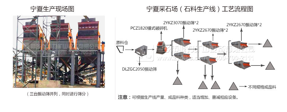 從生產(chǎn)現(xiàn)場圖可以看到,三臺振動篩并駕齊驅(qū),同時進行篩分,可以快速進行破碎物料粒度的篩分,從而形成短時間、率、產(chǎn)量高的大中型砂石骨料生產(chǎn)線。