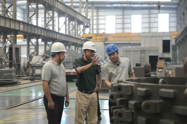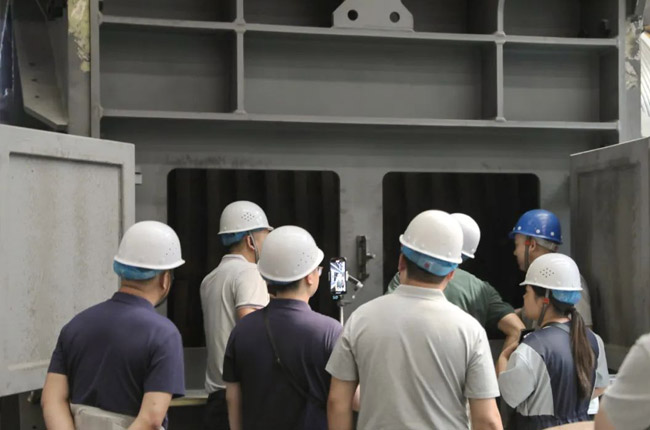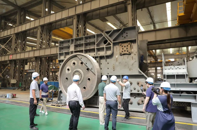中譽(yù)鼎力集團(tuán)副董事長馬鈺博、技術(shù)總監(jiān)劉海淘在智能化車間為砂石骨料網(wǎng)考察團(tuán)成員一一介紹了集團(tuán)主營產(chǎn)品及其制造工藝,并對(duì)硬巖設(shè)備代表產(chǎn)品臥式旋回破碎機(jī)進(jìn)行了詳細(xì)的講解。