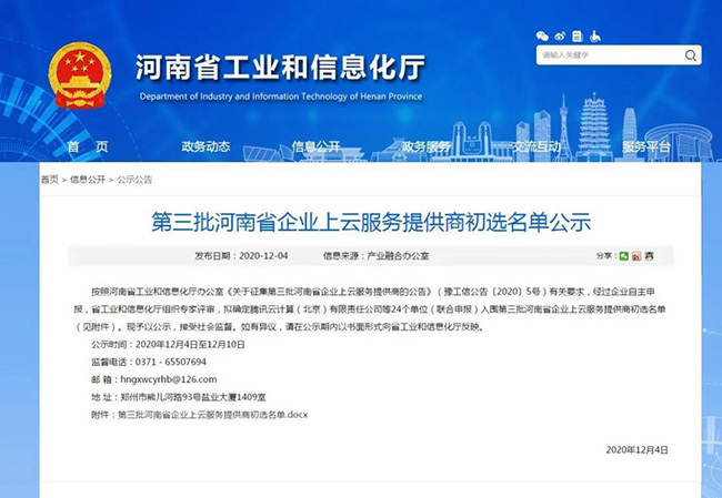 為貫徹落實《河南省智能制造和工業(yè)互聯網發(fā)展三年行動計劃(2018—2020年)》(豫政〔2018〕14號),完善企業(yè)云服務生態(tài)體系,加快省企業(yè)上云上平臺步伐,按照《河南省企業(yè)上云三年行動計劃(2018-2020年)》(豫工信產融〔2018〕92號)和2020年河南工信廳有關工作安排,今年10月,省工信廳公開征集第三批河南省企業(yè)上云服務提供商。經自主申報、評審和網上公示,中譽鼎力軟件科技股份有限公司初步入選云服務商名單。