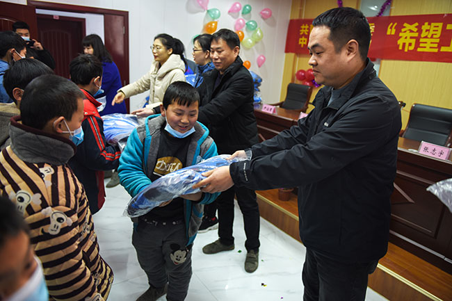 河南中譽(yù)鼎力智能裝備有限公司常務(wù)副總張志宇為學(xué)生分發(fā)棉衣