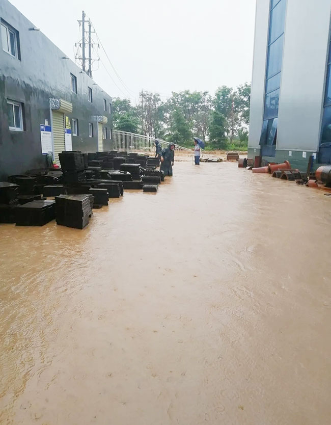 廠區(qū)降水同樣嚴(yán)重,在崗的鼎力人已盡力守住車間倉庫