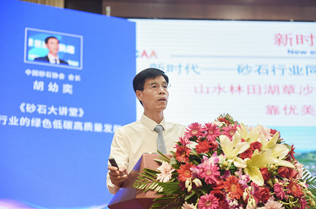 隨后,中砂石協(xié)會會長胡幼奕從當前家環(huán)保形勢、各級發(fā)布砂石文件、砂石骨料市場需求及砂石產(chǎn)業(yè)發(fā)展模式等角度出發(fā),作“砂石行業(yè)的綠色低碳高質(zhì)量發(fā)展”的課程講解。