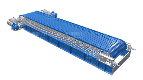電動(dòng)機(jī)轉(zhuǎn)動(dòng),通過傳動(dòng)軸和驅(qū)動(dòng)裝置,帶動(dòng)主軸旋轉(zhuǎn),鏈輪和鏈條安裝在主軸裝置上,通過該裝置帶動(dòng)鏈條上的鏈板做直線運(yùn)動(dòng),鏈條上安裝有承料槽板,鏈板的直線運(yùn)動(dòng)將物料均勻的帶到鏈條的槽板上,并向前輸送,達(dá)到輸送物料的目的。
