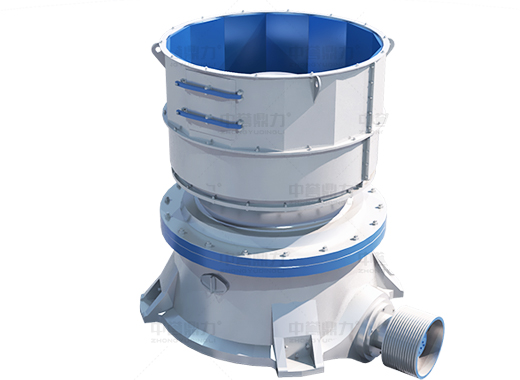 水平軸在電機(jī)帶動(dòng)下旋轉(zhuǎn),通過齒輪帶動(dòng)偏心套旋轉(zhuǎn),偏心套帶動(dòng)動(dòng)錐做圓錐擺動(dòng),與定錐形成連續(xù)擠壓,達(dá)到破碎石塊的目的。 通過調(diào)整動(dòng)錐底部的液壓缸,可以使動(dòng)錐上下運(yùn)動(dòng),從而控制排礦口的大小,進(jìn)而達(dá)到調(diào)成產(chǎn)品粒度大小的目的。液壓缸具有過鐵保護(hù)功能,當(dāng)有不可破碎物進(jìn)入破碎腔,液壓缸控制動(dòng)錐下落,不可破碎物下落排出后,動(dòng)錐自動(dòng)恢復(fù),設(shè)備恢復(fù)到正常工作狀態(tài)。