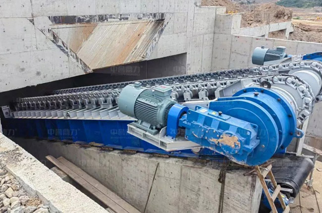01、礦石通過(guò)板喂機(jī)進(jìn)入重錘破進(jìn)行初級(jí)破碎;