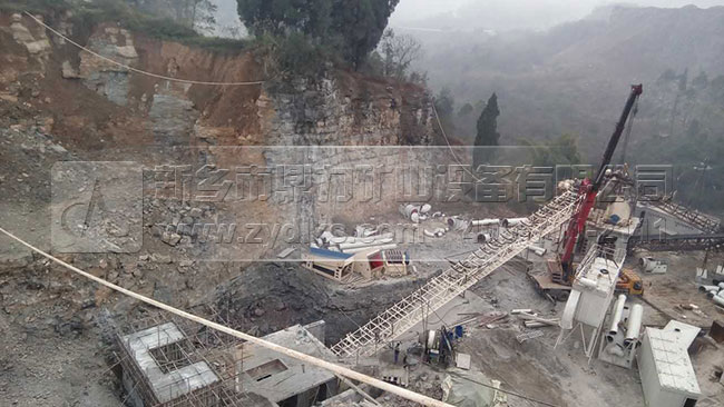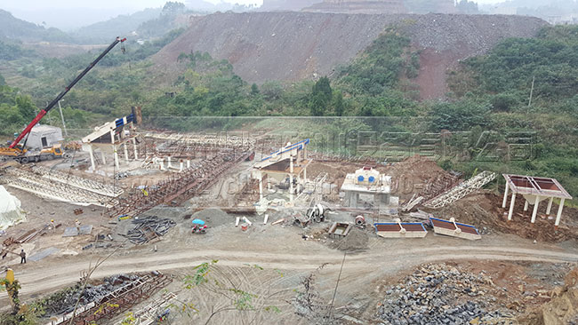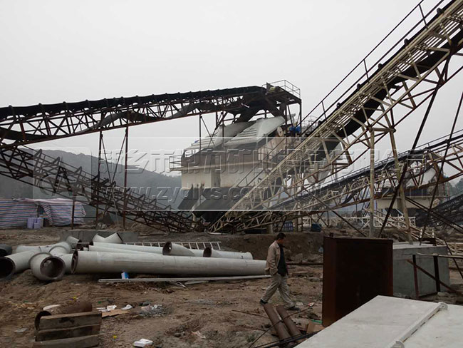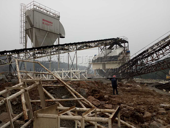 此條時產600噸砂石料生產線主要包括2臺重錘破、11臺篩分設備、2臺ZSJ1218制砂機,并且配備有完備的中轉倉和環(huán)保除塵設備,設備產能是比較大,預計設計的產能是500噸,在實際的生產中達到了600-700噸,生產效果良好。