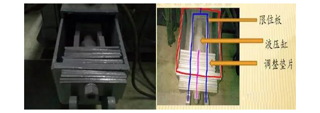 以調(diào)小間距為例:先松開調(diào)整墊片的固定螺釘,然后液壓缸動作,推動里面的彈簧,使反擊板與轉(zhuǎn)子的間距變小,將外面的墊片裝到里面,接著松開液壓缸,直至限位板卡著里面的墊片。