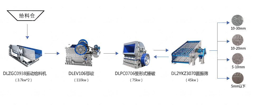 中低硬度物料主機可以選擇錘式破碎機,一次成型,集破碎和整形于一體,初級破碎出一部分成品料,大于30mm以上的物料被返料返送至錘式破碎機中再次破碎,振動篩篩網(wǎng)層級和篩孔尺寸可以根據(jù)客戶對成品料需求進行增減和定制。