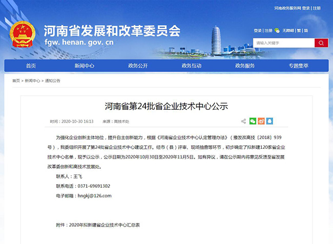 10月30日,河南省發(fā)改委網站發(fā)布《河南省第24批省企業(yè)技術公示》名單,具體如下: