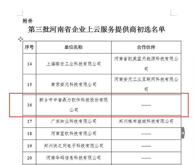 為貫徹落實《河南省智能制造和工業(yè)互聯網發(fā)展三年行動計劃(2018—2020年)》(豫政〔2018〕14號),完善企業(yè)云服務生態(tài)體系,加快省企業(yè)上云上平臺步伐,按照《河南省企業(yè)上云三年行動計劃(2018-2020年)》(豫工信產融〔2018〕92號)和2020年河南工信廳有關工作安排,今年10月,省工信廳公開征集第三批河南省企業(yè)上云服務提供商。經自主申報、評審和網上公示,中譽鼎力軟件科技股份有限公司初步入選云服務商名單。