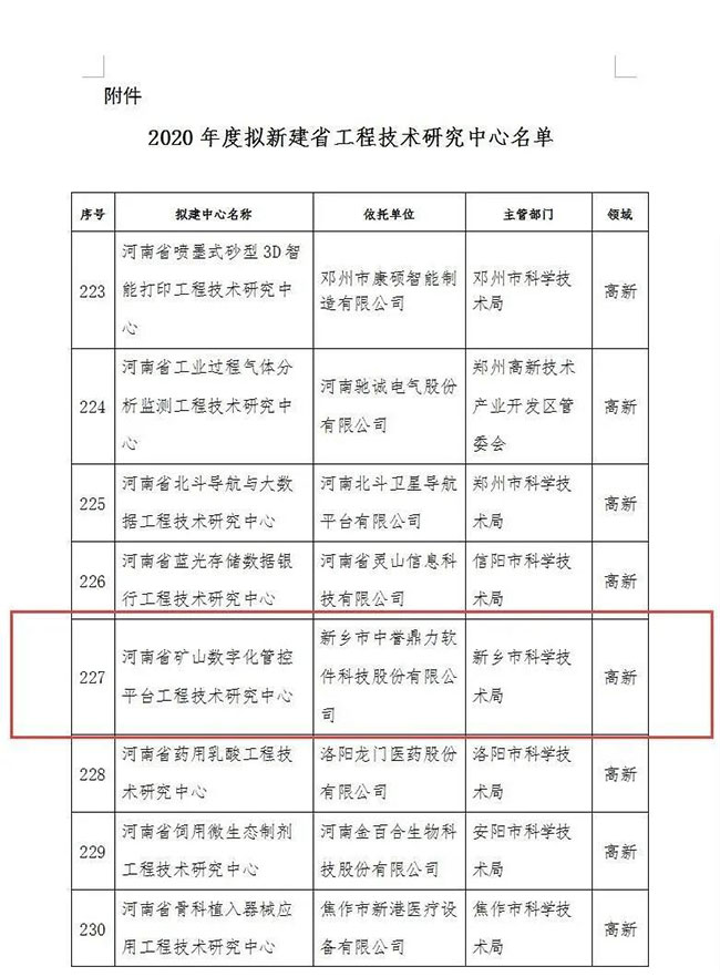 依托新鄉(xiāng)市中譽鼎力軟件科技股份有限公司建設的河南省礦山數字化管控平臺工程技術研究入選擬新建省工程技術研究名單,并順利通過公示。