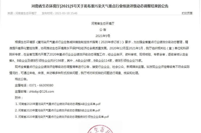 近日,河南省生態(tài)環(huán)境廳公布了《關(guān)于發(fā)布重污染天氣重點(diǎn)行業(yè)績(jī)效評(píng)級(jí)動(dòng)態(tài)調(diào)整結(jié)果的公告》([2021]5號(hào)),河南中譽(yù)鼎力智能裝備有限公司成功入選2020年重污染天氣重點(diǎn)行業(yè)績(jī)效評(píng)級(jí)動(dòng)態(tài)調(diào)整B級(jí)企業(yè)名單,并順利通過公示!