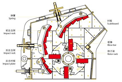 反擊破:反擊式破碎機適用于生產(chǎn)線的二破環(huán)節(jié),主要用于細碎,滿足進料粒度的物料經(jīng)給料裝置進入反擊式破碎機破碎腔中,轉(zhuǎn)子不斷運轉(zhuǎn),進入破碎腔的物料先撞擊到轉(zhuǎn)動的錘頭上,被高速反擊到反擊板上,使已破碎的物料沿切線方向以高速拋向破碎腔另一端的反擊板,再次被破碎,一塊石料經(jīng)過多次破碎,破碎的更,破碎合格的石料及時排出。