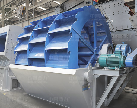 洗砂機(jī)工作時(shí),電機(jī)通過三角帶、減速機(jī)、齒輪減速后帶動(dòng)葉輪緩慢轉(zhuǎn)動(dòng),砂石由給料槽進(jìn)入洗槽中,在葉輪的帶動(dòng)下翻滾,并互相研磨,除去覆蓋砂石表面的雜質(zhì),同時(shí)破壞包覆砂粒的水汽層,以利于脫水;同時(shí)加水,形成強(qiáng)大水流,及時(shí)將雜質(zhì)及比重小的異物帶走,并從溢出口洗槽排出,完成清洗作用。干凈的砂石由葉片帶走,后砂石從旋轉(zhuǎn)的葉輪倒入出料槽,完成砂石的清洗作用。