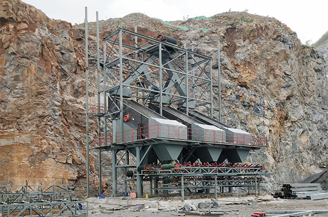 大塊石灰石物料開采后需經(jīng)由震動喂料機勻稱喂料給重型錘式破碎機進行粗碎機,粗碎機后的物料經(jīng)由皮帶輸送設(shè)備傳送至整形錘式破碎機進行中整型破碎作業(yè)。