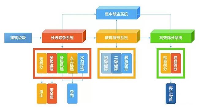工藝流程為:原料(建筑垃圾分揀后石料)→給料→破碎→篩分→再利用→儲存→銷售。整條骨料生產(chǎn)線的運(yùn)營可以實(shí)現(xiàn)建筑垃圾的持續(xù)處理,骨料質(zhì)量,便于后續(xù)資源化利用。