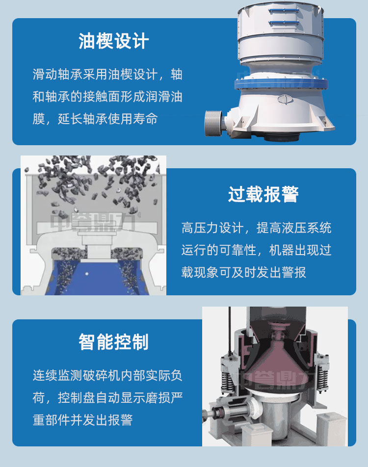RC65圓錐破碎機(jī)有5種腔型,時產(chǎn)385-1565噸,給料尺寸110-450mm,粗碎腔給料尺寸不大于450mm,出料口尺寸10-55mm,也就是粗碎腔可以將粒徑450mm以下的大塊石頭,直接粉碎成22mm以下,且在出料口尺寸可在22-55mm之間可調(diào),RC65圓錐機(jī)重量約52噸。