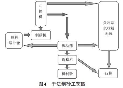 圖3表示砂石分選設備布置在制砂機下料位置,先選粉再粉碎制砂。
